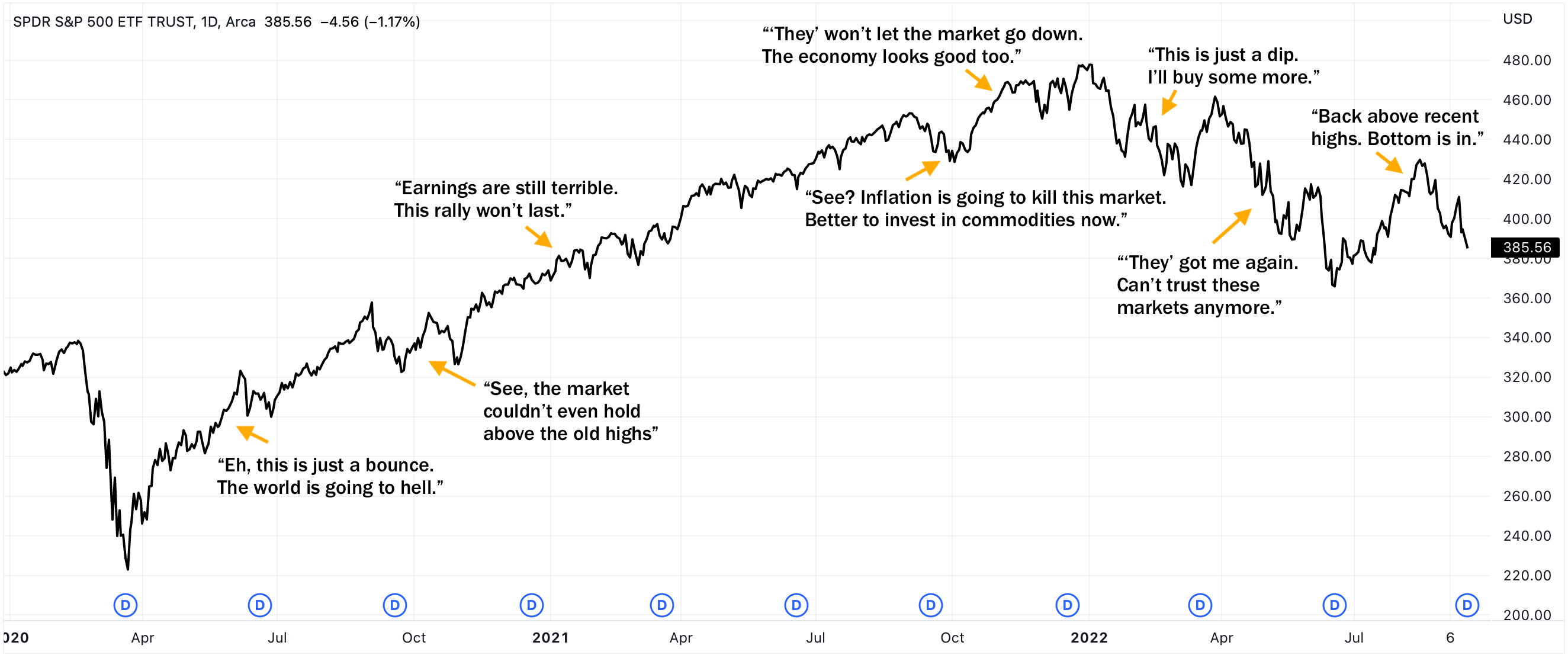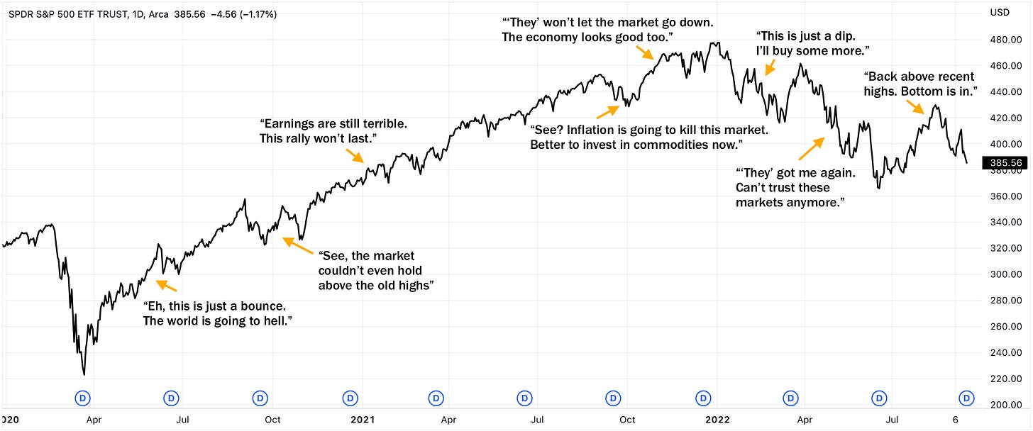 In the markets, a popular remedy is talking. People like to talk and talk and talk. And talk and talk and talk. When positions are going against them, people construct a story of why they bought XYZ in the first place, why it doesn’t make sense to sell it now even though the trend is down and at risk of declining further. They even talk themselves into thinking that losses are a good thing! Most of financial media is devoted to medicating feelings of risk.